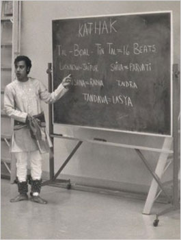Pandit Das’s prolific career advanced the field of kathak not only through his choreographies and performances but also through his pedagogical legacy. Rooted in the tradition and training he brought with him from India, Pandit Das pushed the technical boundaries of strength, speed, and clarity of footwork, as well as many types of swift and stepping chakkars (pirouettes). In deeply examining Indian philosophy, he evolved kathak as a sadhana (devoted practice) through his preeminent innovation, kathak yoga. This inspired practice challenges dancers to integrate music and dance more fully by simultaneously singing, reciting, and dancing, and sometimes even playing an instrument. Kathak yoga took center stage in Shabd (2006), a production that propelled it from a solitary meditative practice to a stunningly complex and intriguing performance art. Leela Dance Collective continues to explore and push the boundaries of kathak yoga in its work California Gharana. Moreover, all Leela students, from beginner to advanced, are trained in kathak yoga. This practice is foundational to our pedagogical philosophy and provides students with a deep, embodied understanding of the relationship between rhythm and movement.